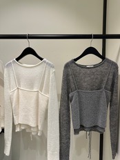 薄手のニットトップスに、同素材のビスチェ風ニットを重ねたデザインで、シンプルながら立体感のあるスタイリングを演出します。