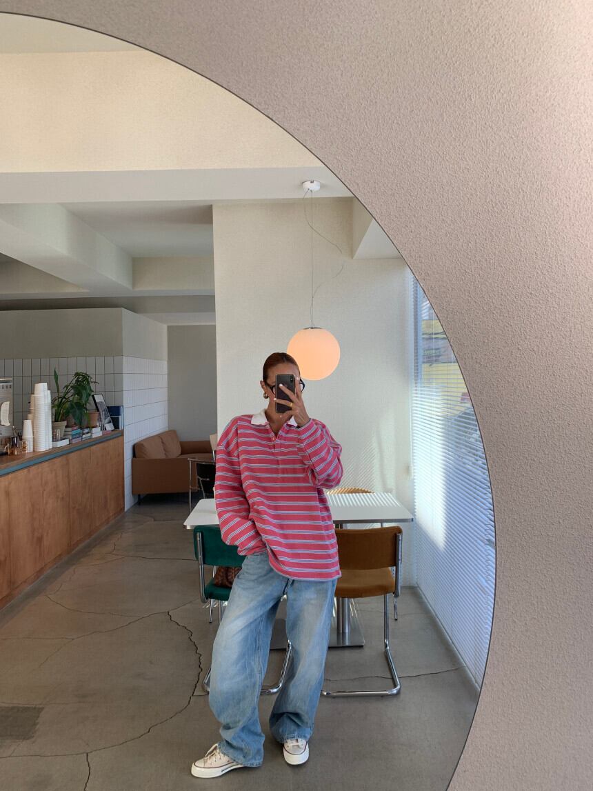 ジーンズやショートパンツと合わせることで、リラックスした休日スタイルを演出。