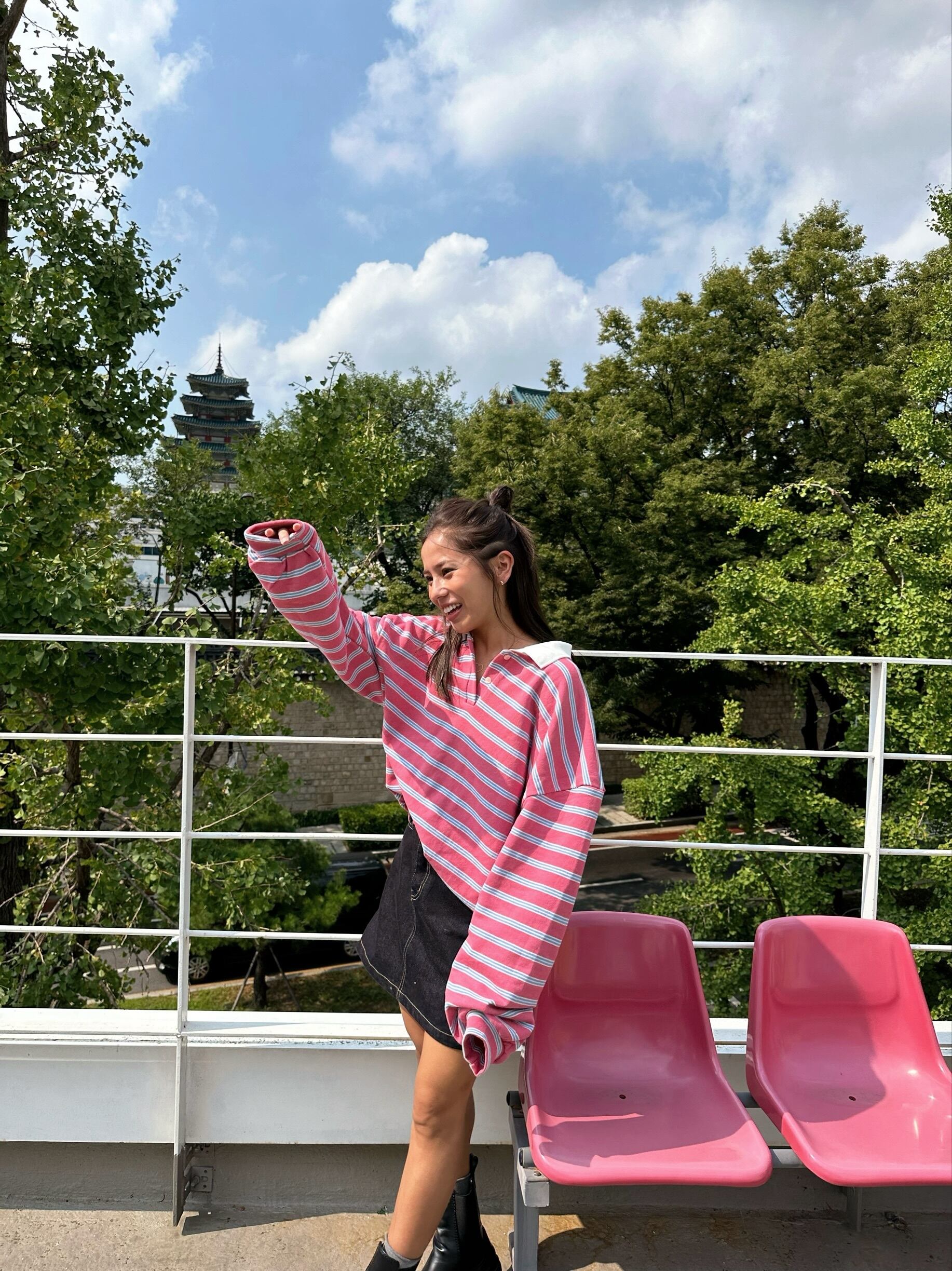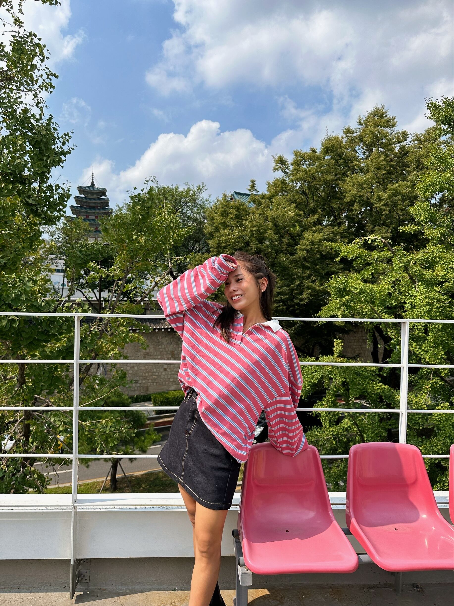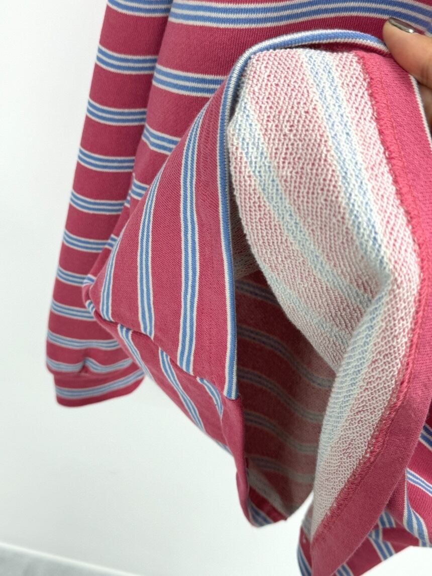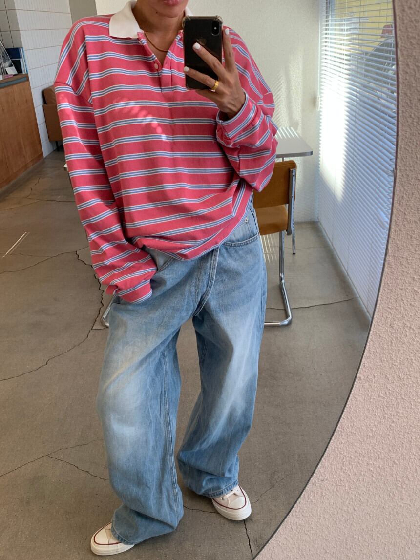 このストライプ柄ラガーシャツは、柔らかいスウェット素材を使用しており、快適さとスタイルを両立させています。